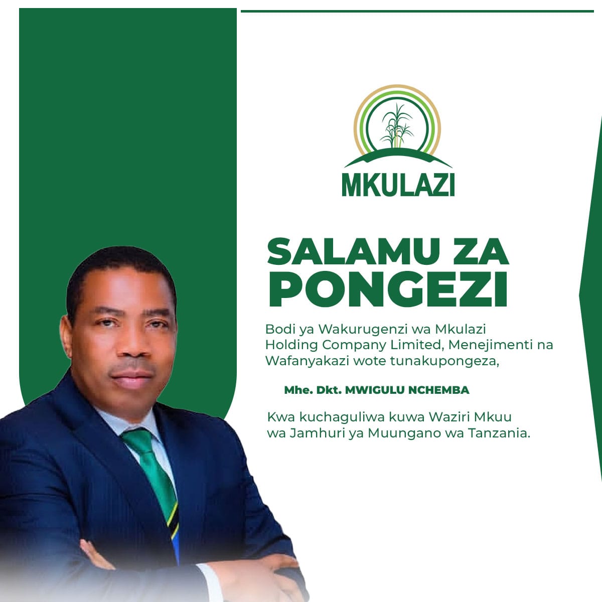 HONGERA MHE. DKT. MWIGULU LAMECK NCHEMBA KWA KUTEULIWA KUWA WAZIRI MKUU WA JAMUHURI YA MUUNGANO WA TANZANIA